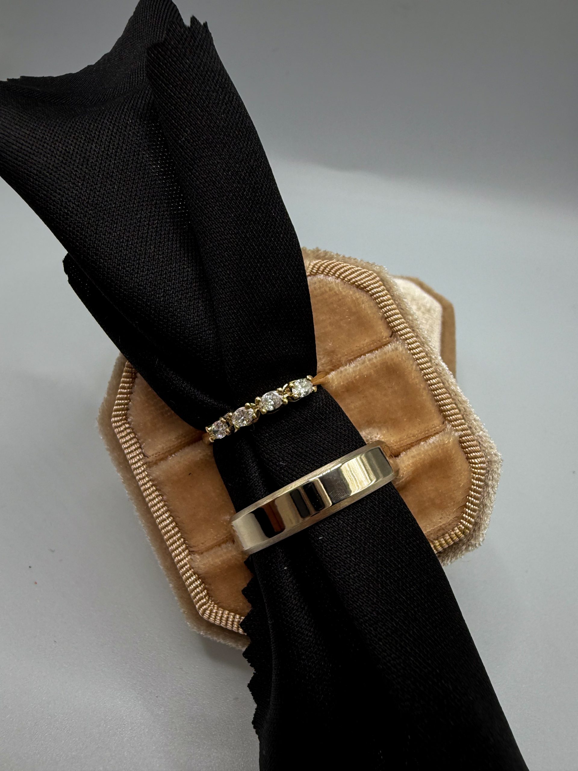 Igen! Ötvözöm például a különböző aranyfajtákat, ezüstöt és modern anyagokat, hogy a kívánt szín, tartósság és stílus megszülessen.